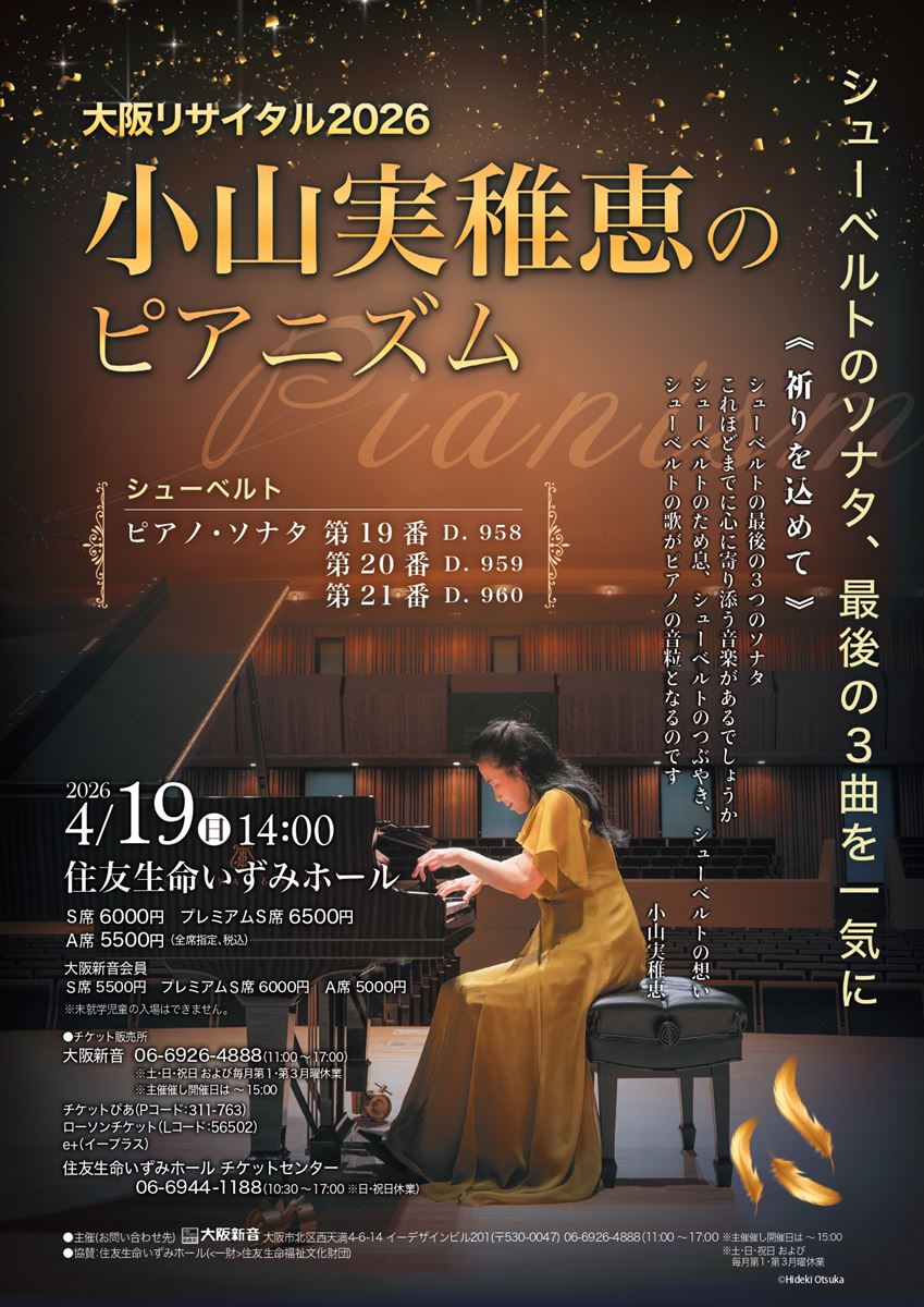 小山実稚恵のピアニズム 大阪リサイタル2026 26/4/19(日) 住友生命いずみホール シェア ツイート シューベルト:ピアノ・ソナタ第19番ハ短調 D.958/シューベルト:ピアノ・ソナタ第20番イ長調 D.959/シューベルト:ピアノ・ソナタ第21番変ロ長調 D.960 公演情報 ジャンル ピアノ・鍵盤楽器 未就学児童は入場不可。 料金 S席-6,000円 A席-5,500円 表示できるチケット情報はありません詳しくはこちら キャスト&スタッフ ピアノ 小山実稚恵 お問い合わせ 大阪新音 公式サイト シェア ツイート