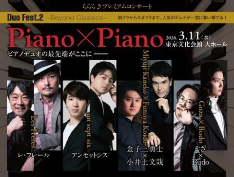ららら♪プレミアムコンサート Duo Fest.2 26/3/11(水) 東京文化会館 大ホール シェア ツイート 公演情報 ジャンル ピアノ・鍵盤楽器 ※全席指定※演奏曲は変更になる場合があります。※車椅子でご来場のお客様はS席チケットをご購入後、ウドー音楽事務所までご連絡ください。(付き添いの方もチケットが必要となります。)※6歳未満(未就学児童)の方のご入場はお断りさせて頂きます。※ご購入手続き後のキャンセル・変更・解約・返金はできません。※営利を目的として第三者に転売する行為を禁止します。 料金 S席-8,000円 A席-7,000円 B席-6,000円 C席-5,000円 表示できるチケット情報はありません詳しくはこちら キャスト&スタッフ 出演 レ・フレール 金子三勇士 小井土文哉 アンセットシス お問い合わせ ウドー音楽事務所 月・水・金 12:00~15:00 ※火・木・土・日・祝日はお休み シェア ツイート