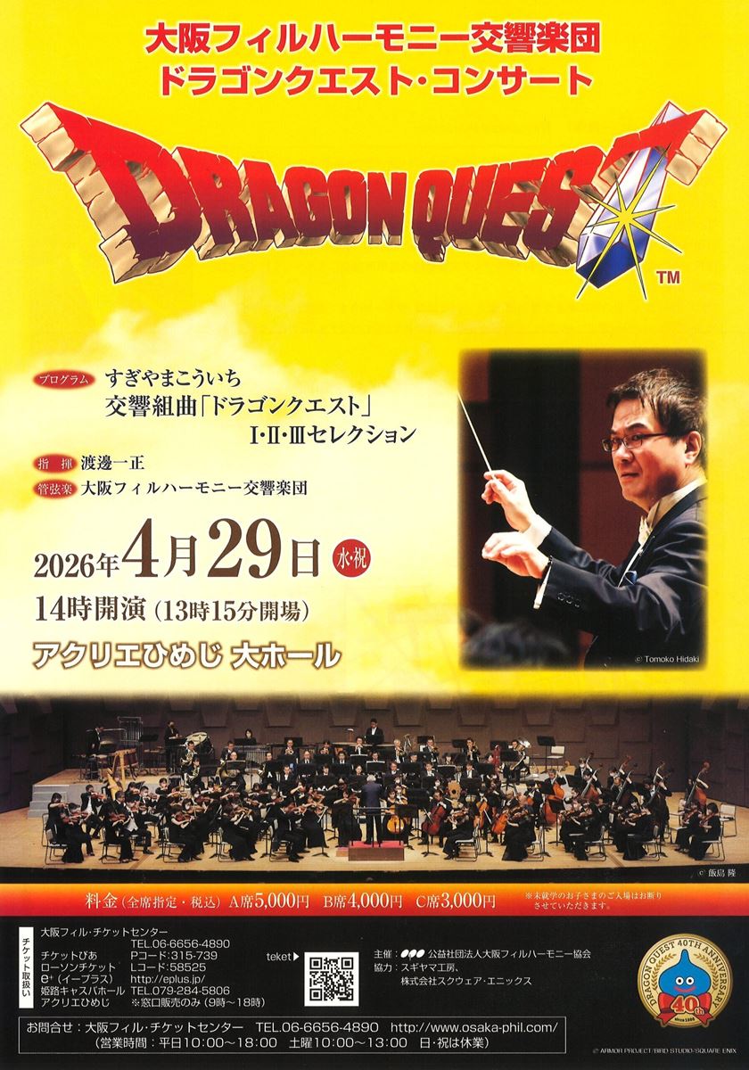 大阪フィルハーモニー交響楽団 ドラゴンクエスト・コンサート 26/4/29(水) アクリエひめじ 大ホール シェア ツイート すぎやまこういち:交響組曲「ドラゴンクエスト」Ⅰ・Ⅱ・Ⅲセレクション 公演情報 ジャンル オーケストラ 未就学児童は入場不可。 料金 A席-5,000円 B席-4,000円 C席-3,000円 表示できるチケット情報はありません詳しくはこちら キャスト&スタッフ 指揮 渡邊一正 管弦楽 大阪フィルハーモニー交響楽団 お問い合わせ 大阪フィル・チケットセンター 公式サイト シェア ツイート