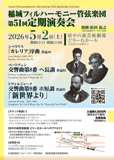 稲城フィルハーモニー管弦楽団 第51回定期演奏会 26/5/2(土) 府中の森芸術劇場 どりーむホール シェア ツイート NHK交響楽団 松田拓之氏の熱い指揮のもと、ドヴォルジャークの新世界をお届けします。ご期待ください。 公演情報 ジャンル オーケストラ 高校生以下無料です。未就学児も客席にて鑑賞可能です。 料金 全席自由-1,000円 表示できるチケット情報はありません詳しくはこちら キャスト&スタッフ 演奏 稲城フィルハーモニー管弦楽団 お問い合わせ 事務局(山澤) シェア ツイート