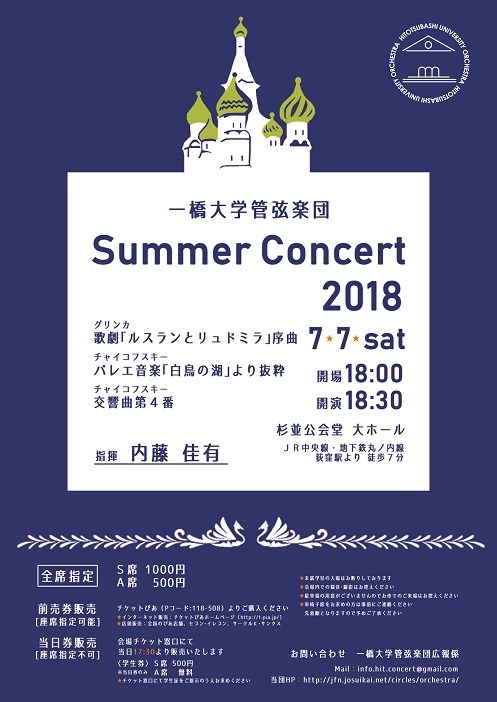一橋大学管弦楽団 サマーコンサート 2018 18/7/7(土) 杉並公会堂 大ホール シェア ツイート グリンカ:歌劇「ルスランとリュドミラ」序曲 / チャイコフスキー:バレエ音楽「白鳥の湖」より抜粋 / チャイコフスキー:交響曲第4番 公演情報 ジャンル オーケストラ 未就学児童は入場不可。 料金 S席:1,000円 A席:500円 表示できるチケット情報はありません詳しくはこちら キャスト&スタッフ 管弦楽 一橋大学管弦楽団 指揮 内藤佳有 お問い合わせ 広報(加藤) 公式サイト シェア ツイート