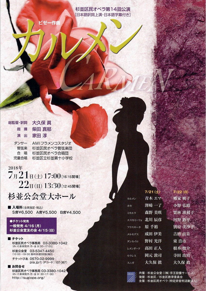 杉並区民オペラ第14回公演 オペラ《カルメン》[日本語訳詞上演・日本語字幕付き] 18/7/21(土)~18/7/22(日) 杉並公会堂 大ホール シェア ツイート ビゼー:オペラ《カルメン》[日本語訳詞上演・日本語字幕付き] 公演情報 ジャンル オペラ 日本語上演、字幕付。 料金 S席:6,500円 A席:5,500円 B席:4,500円 表示できるチケット情報はありません詳しくはこちら キャスト&スタッフ 指揮 柴田真郁 演出 家田淳 カルメン 青木エマ 郷家暁子 ホセ 小野弘晴 澤崎一了 ミカエラ 森野美咲 栗林瑛利子 エスカミーリョ 北川辰彦 河野鉄平 フラスキータ 別府美沙子 原千裕 メルセデス 吉田貞美 成田伊美 ダンカイロ 野村光洋 東浩市 レメンダード 高田正人 根本俊介 モラレス 岡元敦司 寺田功治 スニガ 大久保眞 管弦楽 杉並区民オペラ管弦楽団 合唱 杉並区民オペラ合唱団 お問い合わせ 杉並区民オペラ事務局 公式サイト シェア ツイート