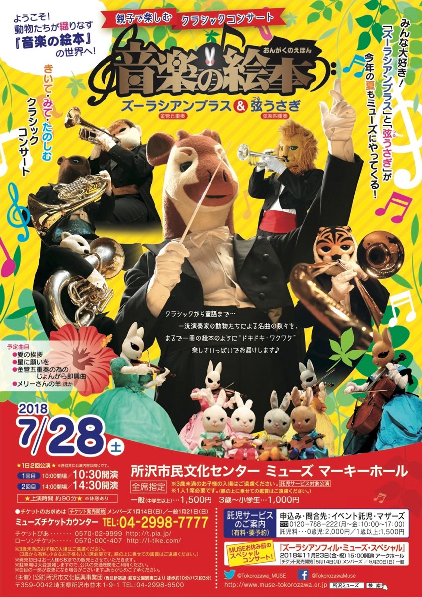 「音楽の絵本」はクラシック音楽における絵本のような世界をイメージして誕生。指揮者のオカピ、金管五重奏の「ズーラシアンブラス」、そして弦楽四重奏の「弦(つる)うさぎ」。動物たちがユーモアたっぷりにお贈りする演奏は、本格的なクラシックから、アニメに童謡まで・・・盛りだくさん。その可愛らしいキャラクターと、次々に繰り出される一流の演奏は、子どもたちだけではなくお父さんお母さんをも夢の世界へ誘います。700席限定、マーキーホールの臨場感溢れる空間で、動物たちが奏でる多彩な音楽の世界をたっぷりとお楽しみください。