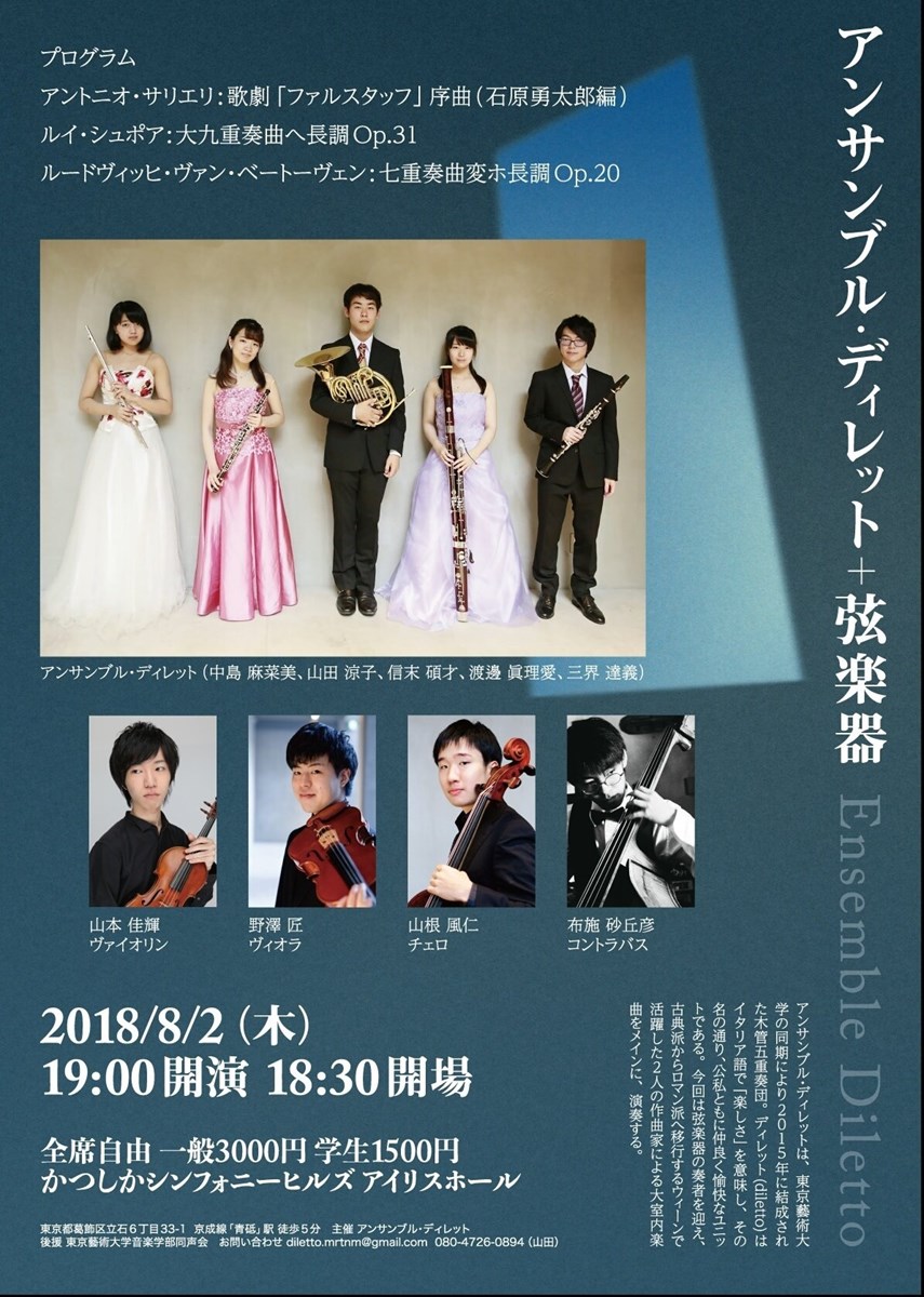 アンサンブル・ディレット+弦楽器 18/8/2(木) かつしかシンフォニーヒルズ アイリスホール シェア ツイート アンサンブル・ディレットは、東京藝術大学の同期により2015年に結成された木管五重奏団。今回は弦楽器の奏者を迎え、古典派からロマン派へ移行するウィーンで活躍した2人の作曲家による大室内楽曲をメインに演奏。 サリエリ:歌劇「ファルスタッフ」序曲(石原勇太郎編) / ベートーヴェン:七重奏曲 / シュポア:大九重奏曲 ほか 公演情報 ジャンル オーケストラ 料金 一般 3,000円 学生 1,500円 キャスト&スタッフ 演奏:アンサンブル・ディレット お問い合わせ 山田 公式サイト シェア ツイート