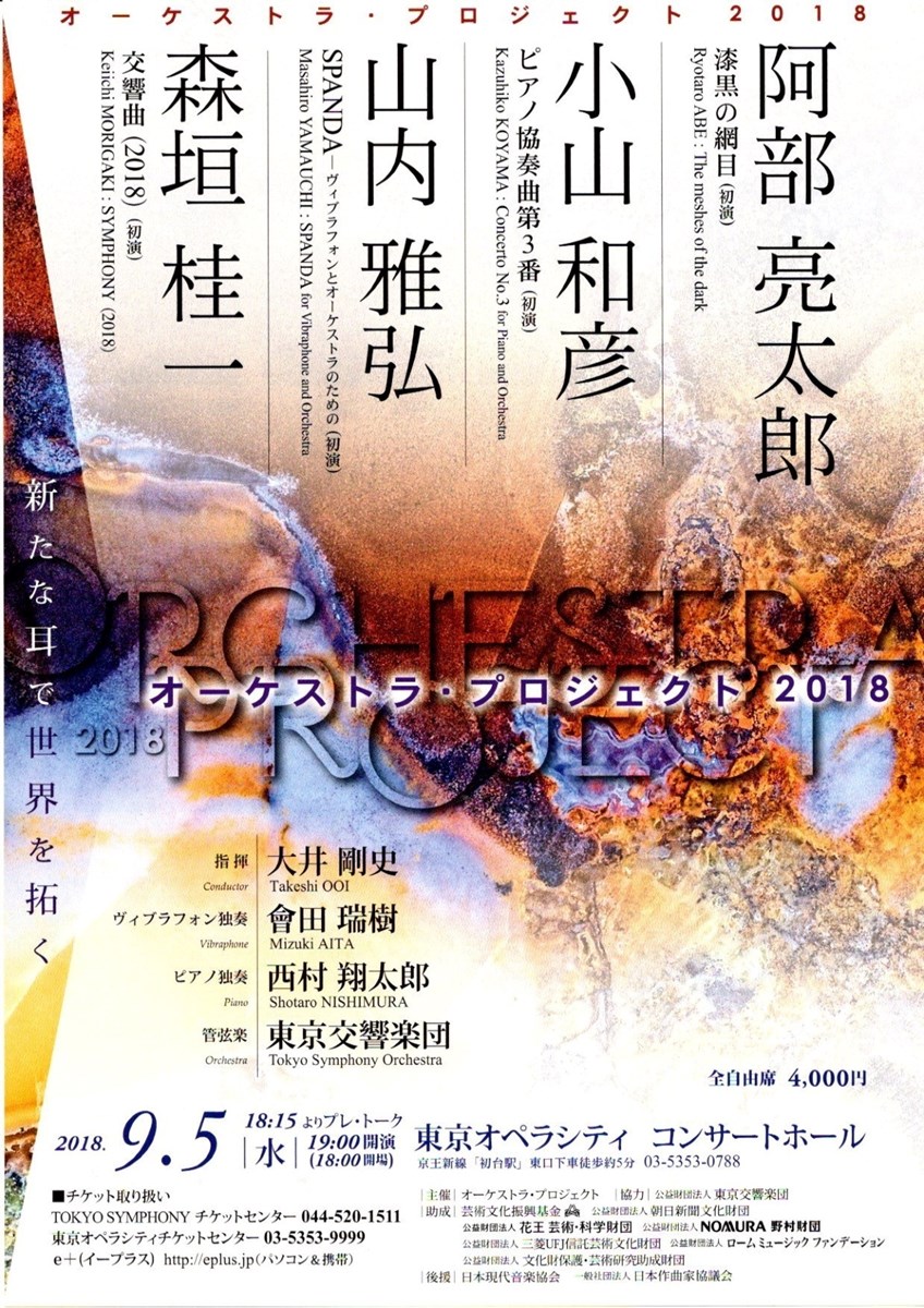オーケストラ・プロジェクト2018 18/9/5(水) 東京オペラシティ コンサートホール:タケミツ メモリアル シェア ツイート 阿部亮太郎:漆黒の網目(新作初演) /小山和彦:ピアノ協奏曲 第3番 (新作初演)/山内雅弘:SPANDA―ヴィブラフォンとオーケストラのための(新作初演)/森垣桂一:交響曲(2018)(新作初演) 公演情報 ジャンル オーケストラ 料金 全自由 4,000円 キャスト&スタッフ 指揮 大井剛史 管弦楽 東京交響楽団 お問い合わせ TOKYO SYMPHONY チケットセンター 公式サイト シェア ツイート