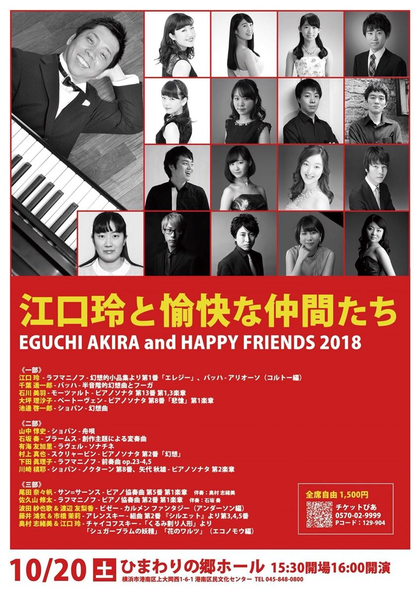 江口玲と愉快な仲間たち 18/10/20(土) 横浜市港南区民文化センター(ひまわりの郷) シェア ツイート 東京藝術大学で学ぶ江口玲門下生が、横浜の地で師匠と共に熱演を繰り広げます。2台のピアノによる演奏も必聴。 サン=サーンス:ピアノ協奏曲第5番「エジプト風」他 公演情報 ジャンル オーケストラ 料金 自由席-1,500円 表示できるチケット情報はありません詳しくはこちら キャスト&スタッフ ピアノ 江口玲 ピアノ:市橋茉莉、尾田奈々帆、山中惇史、川崎槙耶 お問い合わせ 東京藝術大学 江口玲クラス 川崎 公式サイト シェア ツイート