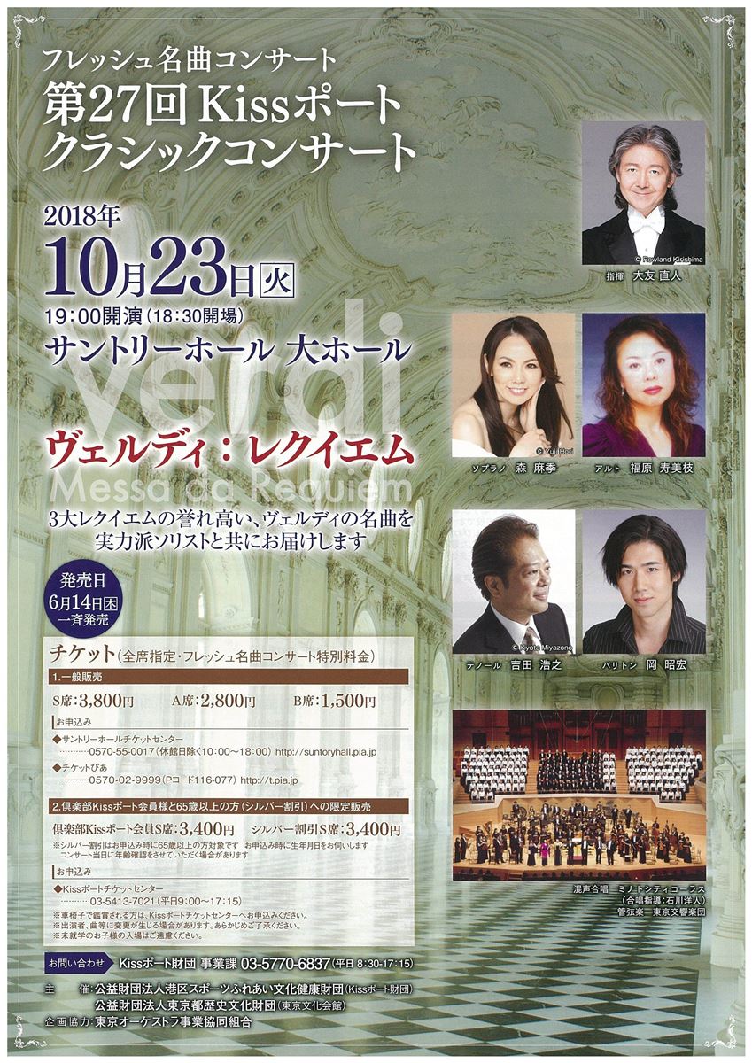フレッシュ名曲コンサート 第27回Kissポートクラシックコンサート 18/10/23(火) サントリーホール 大ホール シェア ツイート 3大レクイエムの誉れ高いヴェルディの華麗なる名曲を、実力派ソリストと共に上演。 ヴェルディ:レクイエム 公演情報 ジャンル オーケストラ 未就学児童は入場不可。 料金 S席-3,800円 A席-2,800円 B席-1,500円 表示できるチケット情報はありません詳しくはこちら キャスト&スタッフ 指揮 大友直人 管弦楽 東京交響楽団 ソプラノ 森麻季 アルト 福原寿美枝 テノール 吉田浩之 バリトン:岡昭宏/混声合唱:ミナトシティコーラス[ お問い合わせ Kissポート財団事業課 公式サイト シェア ツイート