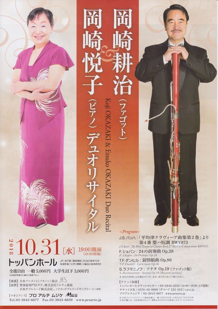 岡崎耕治&岡崎悦子 デュオ リサイタル 18/10/31(水) トッパンホール シェア ツイート J.S.バッハ:平均律クラヴィーア曲集第2巻より 第4曲 嬰ハ短調 BWV873/ショパン:24の前奏曲 Op.28/ダンヒル:叙情組曲/ラフマニノフ:チェロ・ソナタ ト短調 Op.19(ファゴット版) 公演情報 ジャンル オーケストラ 料金 全自由席 一般-5,000円 全自由席 大学生以下-3,000円 表示できるチケット情報はありません詳しくはこちら キャスト&スタッフ ファゴット 岡崎耕治 ピアノ:岡崎悦子 お問い合わせ プロ アルテ ムジケ 公式サイト シェア ツイート