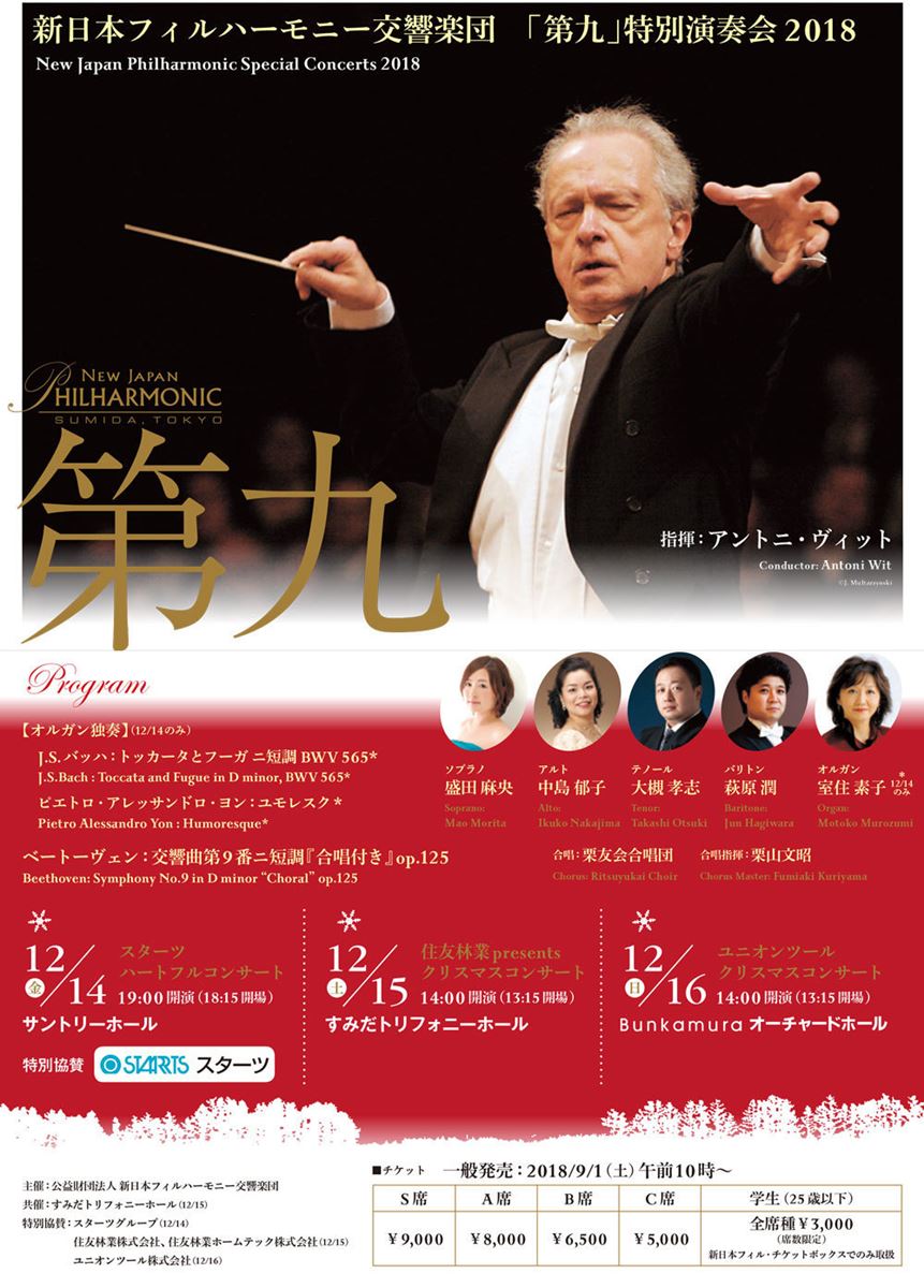 新日本フィル「第九」特別演奏会2018 18/12/16(日) オーチャードホール シェア ツイート ベートーヴェン:交響曲第9番ニ短調『合唱付き』op.125 公演情報 ジャンル オーケストラ 未就学児童は入場不可。1階の最前列は6列目になります。 料金 S席:9,000円A席:8,000円B席:6,500円C席:5,000円 表示できるチケット情報はありません詳しくはこちら キャスト&スタッフ 指揮 アントニ・ヴィット ソプラノ 盛田麻央 アルト 中島郁子 バリトン 萩原潤 管弦楽 新日本フィルハーモニー交響楽団 テノール:大槻孝志/合唱:栗友会合唱団/合唱指揮:栗山文昭 お問い合わせ 新日本フィル・チケットボックス 公式サイト シェア ツイート