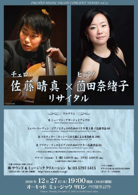 チェロ/佐藤晴真×ピアノ/薗田奈緒子 リサイタル 18/12/27(木) オーキッド ミュージック サロン シェア ツイート シューマン:アダージョとアレグロ/ベートーヴェン:チェロソナタ第3番 作品69/マルティヌー:ロッシーニの主題による変奏曲 H.290/ブリテン:チェロソナタ 作品65 公演情報 ジャンル 器楽 ピアノ・鍵盤楽器 未就学児童の入場はご遠慮ください。 料金 全席自由 一般:3,500円全席自由 学生:2,000円 表示できるチケット情報はありません詳しくはこちら キャスト&スタッフ チェロ 佐藤晴真 ピアノ 薗田奈緒子 お問い合わせ (株)サウンド・アンド・ミュージック・クリエーション 公式サイト シェア ツイート