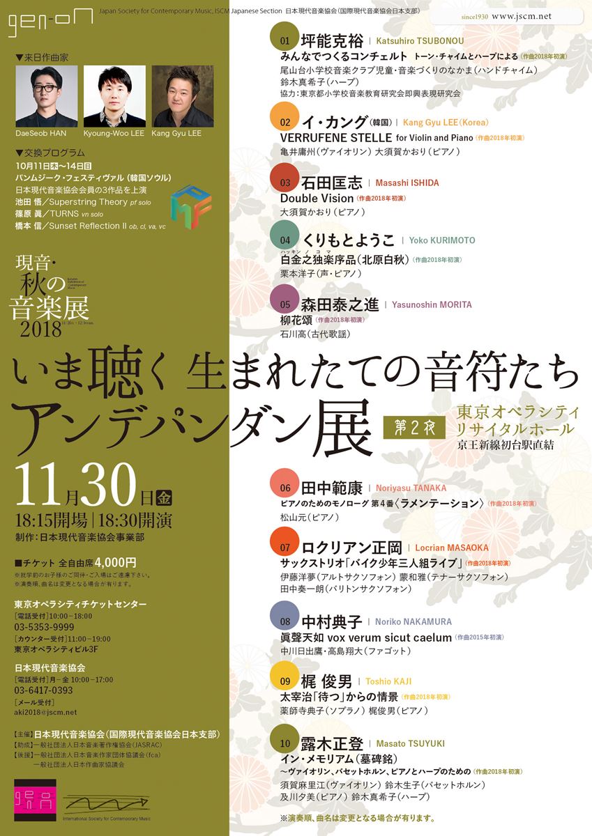坪能克裕:みんなでつくるコンチェルト トーン・チャイムとハープによる(作曲2018年初演)/イ・カング(韓国):VERRUFENE STELLE for Violin and Piano(作曲2018年初演)/石田匡志:Double Vision(作曲2018年初演)/くりもとようこ:白金之独楽序品(北原白秋)(作曲2018年初演)/森田泰之進:柳花頌(作曲2018年初演)/田中範康:ピアノのためのモノローグ 第4番〈ラメンテーション〉(作曲2018年初演)/ロクリアン正岡:サックストリオ「バイク少年三人組ライブ」(作曲2018年初演)/中村典子:眞聲天如 vox verum sicut caelum(作曲2015年初演)/梶 俊男:太宰治「待つ」からの情景(作曲2018年初演)/露木正登:イン・メモリアム(墓碑銘) 〜ヴァイオリン、バセットホルン、ピアノとハープのための(作曲2018年初演)