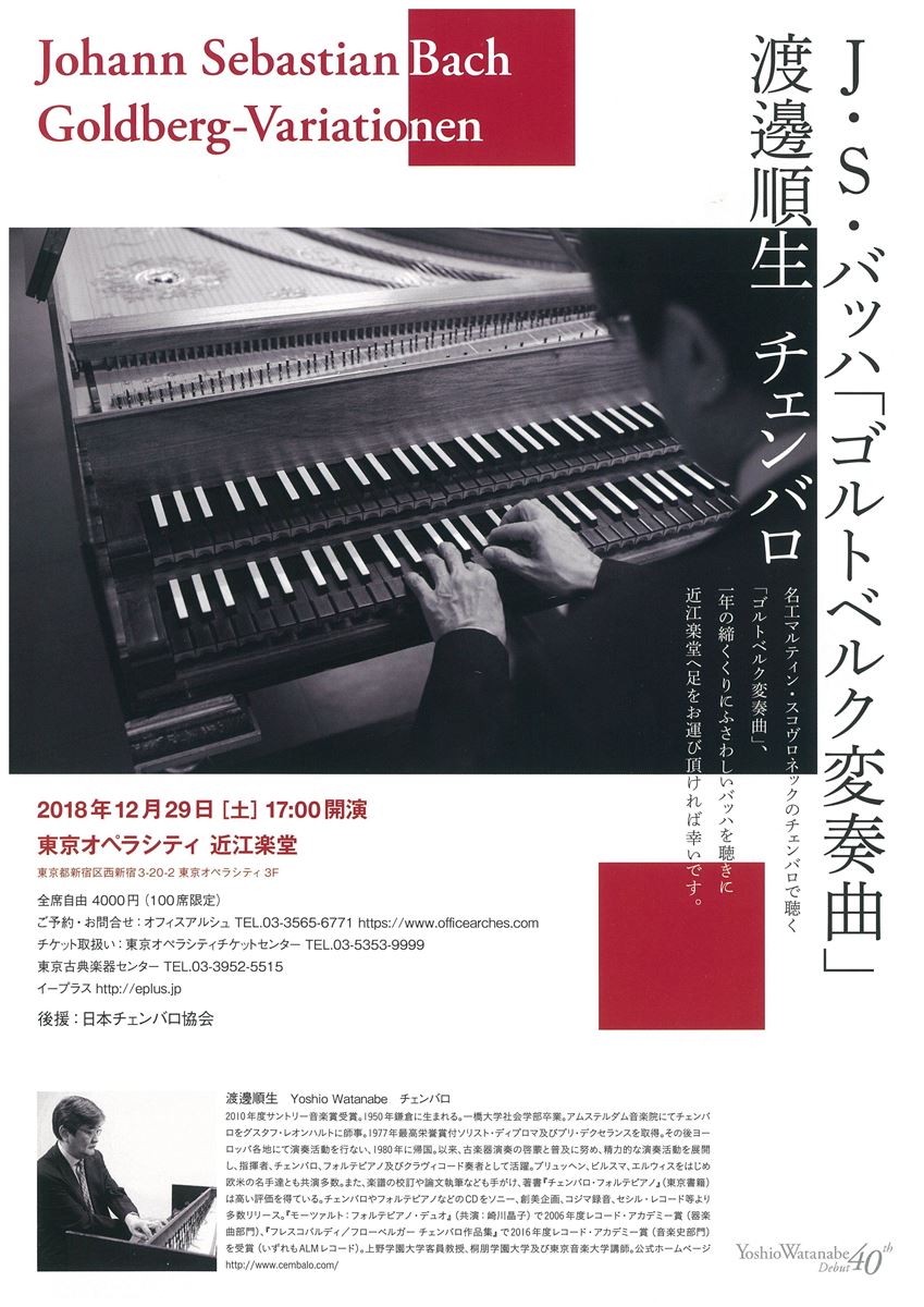 渡邊順生 「ゴルトベルク変奏曲」 18/12/29(土) 近江楽堂 シェア ツイート 渡邊順生デビュー40周年記念 J.S.バッハ:ゴルトベルク変奏曲 BWV988 公演情報 ジャンル ピアノ・鍵盤楽器 料金 全席自由:4,000円 キャスト&スタッフ チェンバロ 渡邊順生 お問い合わせ オフィスアルシュ 公式サイト シェア ツイート