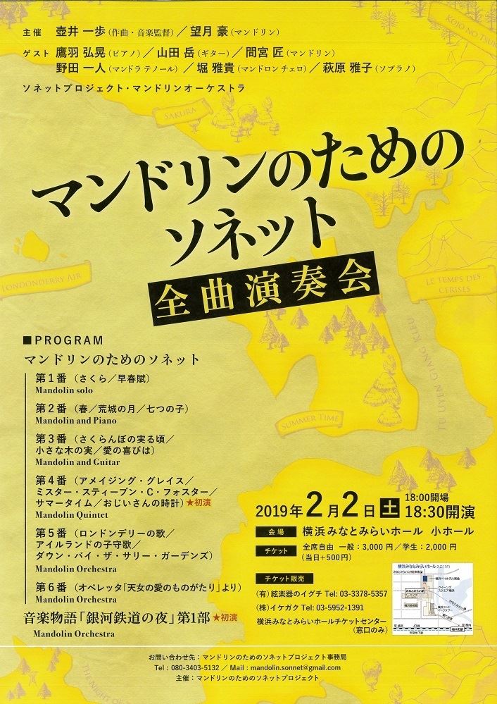 マンドリンのためのソネット全曲演奏会 19/2/2(土) 横浜みなとみらいホール 小ホール シェア ツイート 壷井一歩:マンドリンのためのソネット第5番、第6番、音楽物語「銀河鉄道の夜」第1部 公演情報 ジャンル 器楽 料金 全席自由:3,000円学生:2,000円※当日各500円増 キャスト&スタッフ 指揮 鷹羽弘晃 マンドリン:望月豪/マンドリンチェロ:堀雅貴/ギター:山田岳 お問い合わせ 事務局(壷井) シェア ツイート