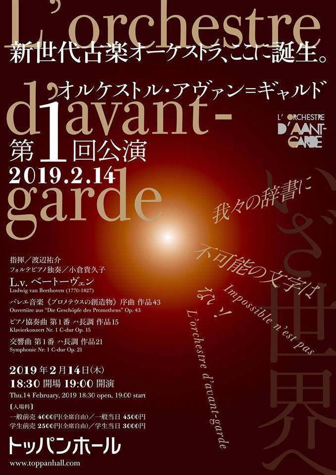 オルケストル・アヴァン=ギャルド 第一回公演 19/2/14(木) トッパンホール シェア ツイート L'orchestre d'avant-garde《オルケストル・アヴァン=ギャルド》は、マヨラ・カナームス東京の結成5周年を機に発足。既存の枠組みを超え、これからの日本の音楽界を担う新しい存在を目指す若い世代によるオリジナル楽器オーケストラとして、今後の活躍が期待される。 ベートーヴェン:ピアノ協奏曲第1番、交響曲第1番 他 公演情報 ジャンル 室内楽 オーケストラ 料金 全席自由:4,000円 表示できるチケット情報はありません詳しくはこちら キャスト&スタッフ 指揮 渡辺祐介 フォルテピアノ 小倉貴久子 お問い合わせ 株式会社ギタルラ社東京古典楽器センター 公式サイト シェア ツイート