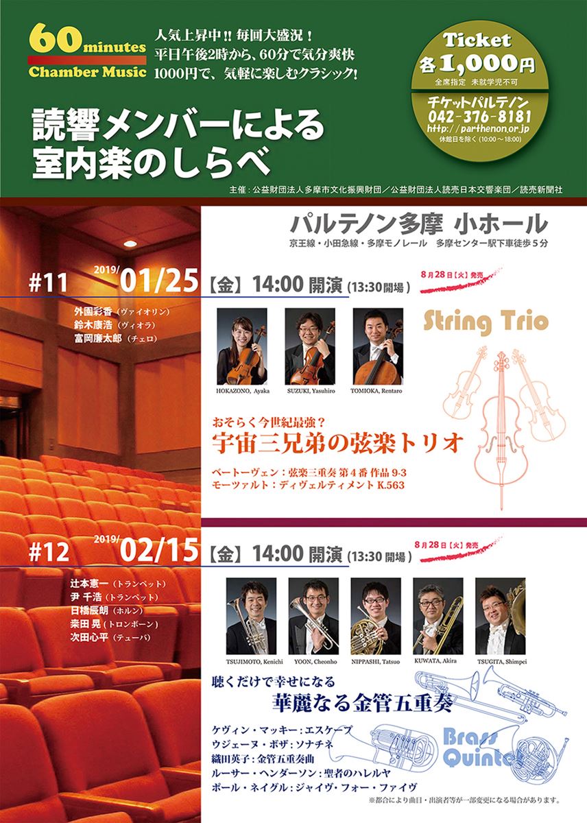 読響メンバーによる室内楽のしらべ #12 19/2/15(金) パルテノン多摩 小ホール シェア ツイート 聴くだけで幸せになる 華麗なる金管五重奏 ケヴィン・マッキー:エスケープ/ウジェーヌ・ボザ:ソナチネ/織田英子:金管五重奏曲/ルーサー・ヘンダーソン:聖者のハレルヤ/ポール・ネイグル:ジャイヴ・フォー・ファイヴ 公演情報 ジャンル 室内楽 料金 全席指定:1,000円 キャスト&スタッフ トランペット:辻本憲一、尹 千浩/ホルン:日橋辰朗/トロンボーン:栞田晃/チューバ:次田心平 お問い合わせ チケットパルテノン 公式サイト シェア ツイート