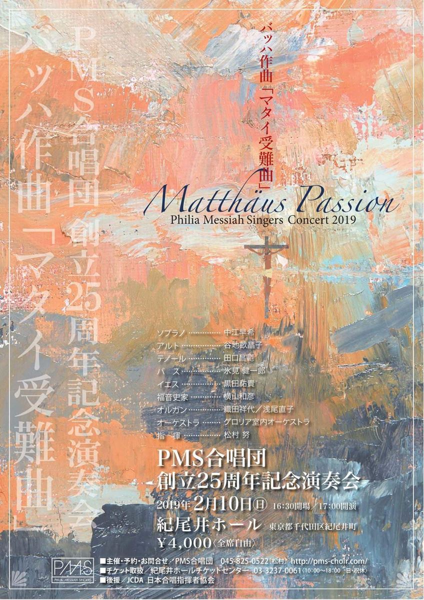 PMS合唱団 創立25周年記念演奏会 19/2/10(日) 紀尾井ホール シェア ツイート バッハ:マタイ受難曲 公演情報 ジャンル 声楽 料金 全席自由:4,000円 キャスト&スタッフ 指揮 松村努 ソプラノ 中江早希 アルト 谷地畝晶子 福音史家:横山和彦/イエス:黒田祐貴/テノール:田口昌範/バリトン:氷見健一郎/オルガン:織田祥代,浅尾直子/管弦楽:グロリア室内オーケストラ お問い合わせ 松村 シェア ツイート