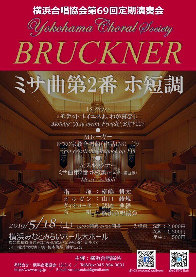 横浜合唱協会 第69回定期演奏会 19/5/18(土) 横浜みなとみらいホール 大ホール シェア ツイート A.ブルックナー : ミサ曲 第2番 e-moll WAB27(オルガン編曲版)/J.S.バッハ : モテット「イエスは我が喜び BWV 227」/M.レーガー : 「8つのモテット」より 第1,3,4,6曲 公演情報 ジャンル 声楽 料金 S席:2,000円A席:1,500円 表示できるチケット情報はありません詳しくはこちら キャスト&スタッフ 指揮 柳嶋耕太 合唱 横浜合唱協会 ヴィオローネ : 諸岡典経/オルガン : 山口綾規 お問い合わせ 横浜合唱協会 公式サイト シェア ツイート