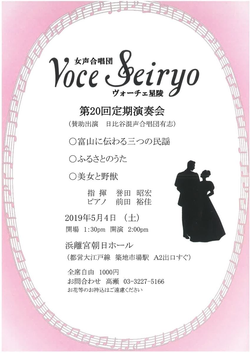 ヴォーチェ星陵 第20回定期演奏会 19/5/4(土) 浜離宮朝日ホール シェア ツイート 富山に伝わる三つの民謡/ふるさとのうた/美女と野獣 公演情報 ジャンル 声楽 料金 全席自由:1,000円 キャスト&スタッフ 合唱:ヴォーチェ星陵/指揮:誉田昭宏/ピアノ:前田裕佳/賛助出演:日比谷混声合唱団有志 お問い合わせ ヴォーチェ星陵(髙瀨) 公式サイト シェア ツイート