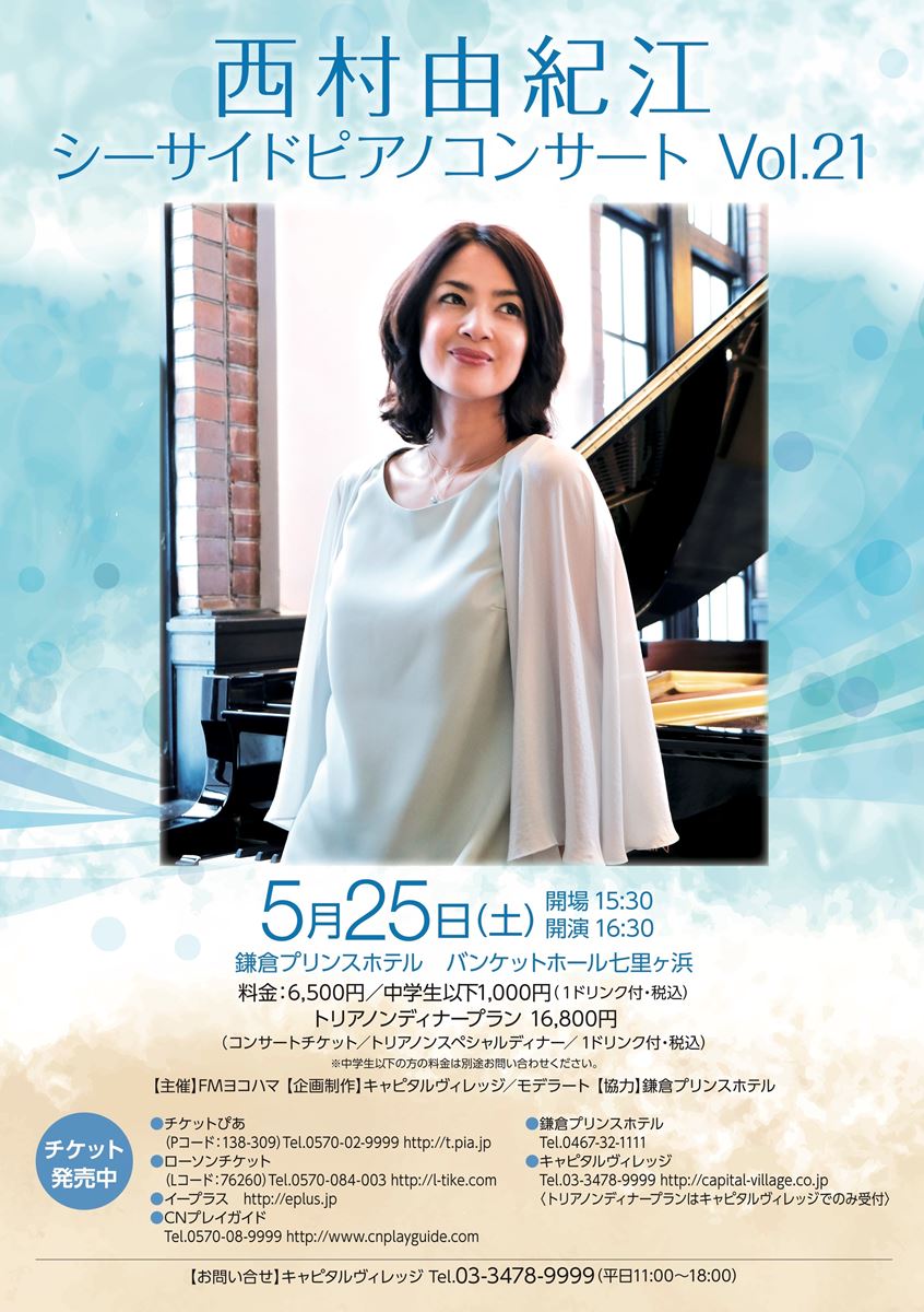 西村由紀江 シーサイドピアノコンサート Vol.21 19/5/25(土) 鎌倉プリンスホテル バンケットホール七里ヶ浜 シェア ツイート 公演情報 ジャンル ピアノ・鍵盤楽器 1ドリンク付。 料金 全席指定一般:6,500円中学生以下:1,000円 表示できるチケット情報はありません詳しくはこちら キャスト&スタッフ ピアノ 西村由紀江 お問い合わせ キャピタルヴィレッジ 公式サイト シェア ツイート