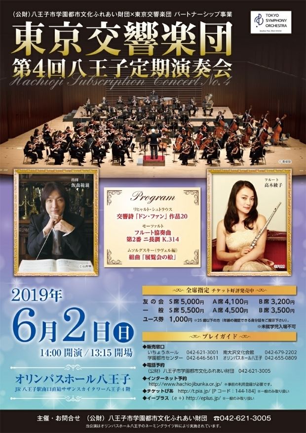 東京交響楽団 第4回八王子定期演奏会 19/6/2(日) オリンパスホール八王子 シェア ツイート リヒャルト・シュトラウス:交響詩『ドン・ファン』作品20/モーツァルト:フルート協奏曲 第二番 ニ長調 K.314/ムソルグスキー(ラヴェル編):組曲『展覧会の絵』 公演情報 ジャンル オーケストラ 未就学児童は入場不可。 料金 S席:5,500円A席:4,500円B席:3,500円S席ユース券:1,000円A席ユース券:1,000円B席ユース券:1,000円 ユース券:25歳以下/公演当日要身分証明書 表示できるチケット情報はありません詳しくはこちら キャスト&スタッフ 指揮 飯森範親 フルート 高木綾子 管弦楽 東京交響楽団 お問い合わせ 八王子市学園都市文化ふれあい財団 公式サイト シェア ツイート
