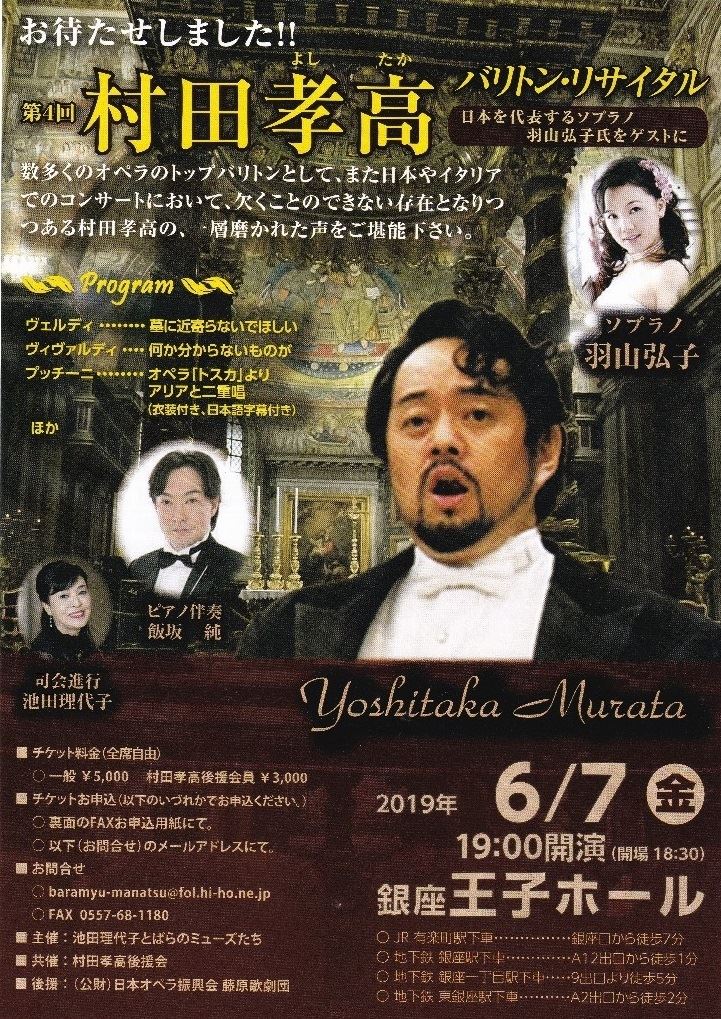 第4回 村田孝高バリトンリサイタル 19/6/7(金) 王子ホール シェア ツイート ヴェルディ:墓に近寄らないでほしい/ヴィヴァルディ:何か分からないものが/プッチーニ:オペラ『トスカ』より アリアと二重唱(衣装付き、日本語字幕付き)他 公演情報 ジャンル 声楽 料金 全席自由一般:5,000円 キャスト&スタッフ バリトン:村田孝高/ソプラノ:羽山弘子/ピアノ:飯坂 純/司会進行:池田理代子 お問い合わせ 池田理代子とばらのミューズたち シェア ツイート