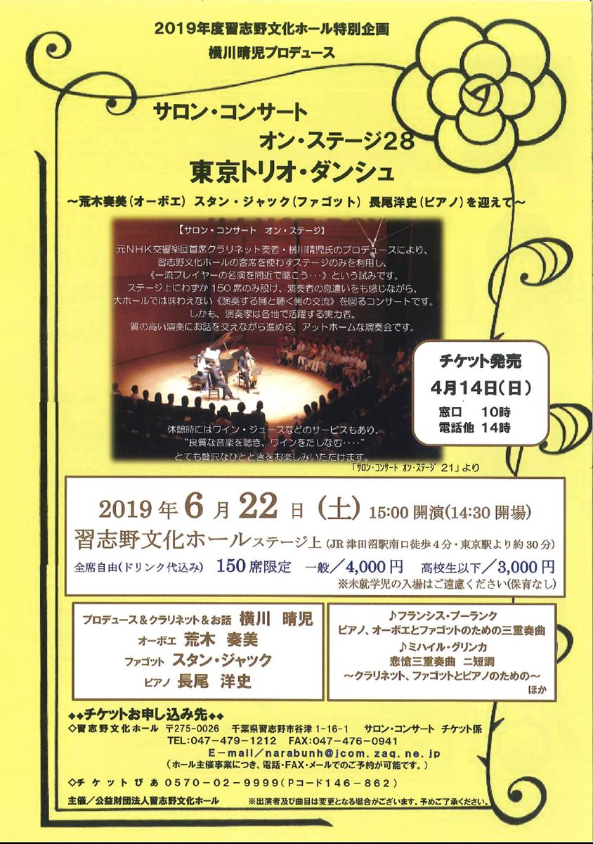 サロン・コンサート オン・ステージ28 19/6/22(土) 習志野文化ホール ステージ上 シェア ツイート 公演情報 ジャンル 器楽 室内楽 未就学児童は入場不可。チケットはドリンク付。 料金 全席自由 一般:4,000円全席自由 高校生以下:3,000円 表示できるチケット情報はありません詳しくはこちら キャスト&スタッフ オーボエ 荒木奏美 ピアノ 長尾洋史 クラリネット・プロデュース:横川晴児/ファゴット:スタン・ジャック お問い合わせ 習志野文化ホール シェア ツイート