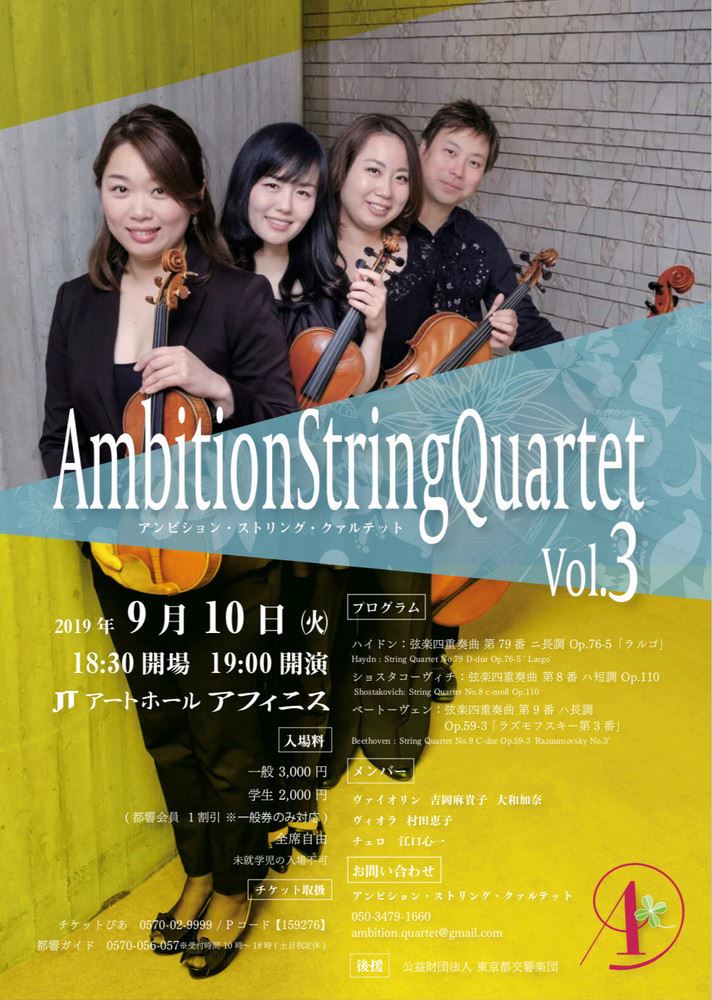 Ambition String Quartet Vol.3 19/9/10(火) JTアートホールアフィニス シェア ツイート ハイドン:弦楽四重奏曲 第79番 ニ長調 Op.76-5「ラルゴ」/ショスタコーヴィチ:弦楽四重奏曲 第8番 ハ短調 Op.110/ベートーヴェン:弦楽四重奏曲 第9番 ハ長調 Op.59-3「ラズモフスキー第3番」 公演情報 ジャンル 室内楽 料金 全席自由‐3,000円学生-2,000円 キャスト&スタッフ ヴァイオリン:吉岡麻貴子、大和加奈/ヴィオラ:村田恵子/チェロ:江口心一 お問い合わせ アンビション・ストリング・クァルテット 公式サイト シェア ツイート