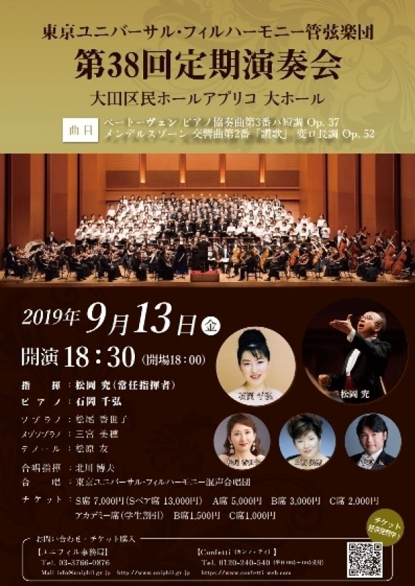 東京ユニバーサル・フィルハーモニー管弦楽団 第38回定期演奏会 19/9/13(金) 大田区民ホール・アプリコ 大ホール シェア ツイート ベートーヴェン:ピアノ協奏曲第3番ハ短調 Op.37/メンデルスゾーン:交響曲第2番「讃歌」変ロ長調 Op.52 公演情報 ジャンル オーケストラ 料金 S席-7,000円(Sペア席-13,000円)A席-5,000円B席-3,000円C席-2,000円アカデミー席(学生割引)B席-1,500円C席-1,000円 ※Sペア席とアカデミー席については、ユニフィル事務局のみでの受付となります。 キャスト&スタッフ 指揮:松岡究/ピアノ:石岡千弘/ソプラノ:松尾香世子/メゾソプラノ:三宮美穂/テノール:松原友/合唱:東京ユニバーサル・フィルハーモニー混声合唱団/合唱指揮:北川博夫/管弦楽:東京ユニバーサル・フィルハーモニー管弦楽団 お問い合わせ ユニフィル事務局 公式サイト シェア ツイート