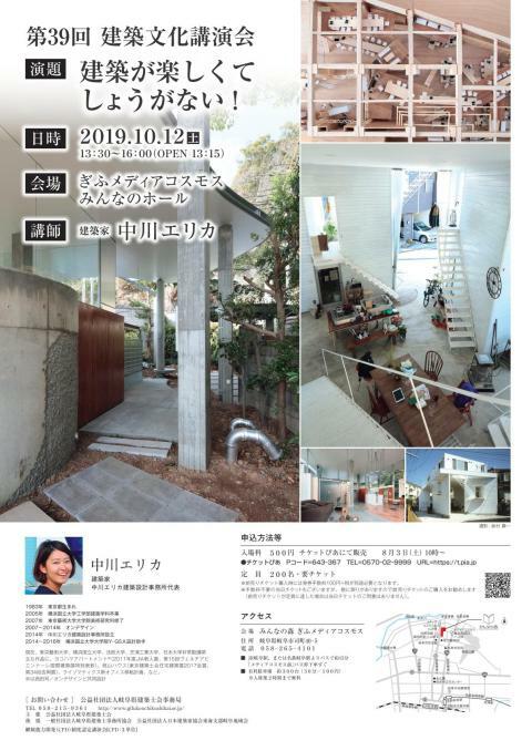公益社団法人岐阜県建築士会第39回建築文化講演会 19/10/12(土) みんなの森 ぎふメディアコスモス みんなのホール シェア ツイート 演題 建築が楽しくてしょうがない! 開催情報 ジャンル トークイベント 料金 全席自由-500円 表示できるチケット情報はありません詳しくはこちら キャスト&スタッフ 出演 中川エリカ 講師 中川エリカ [出演]中川エリカ [講師]中川エリカ お問い合わせ 公益社団法人岐阜県建築士会 シェア ツイート
