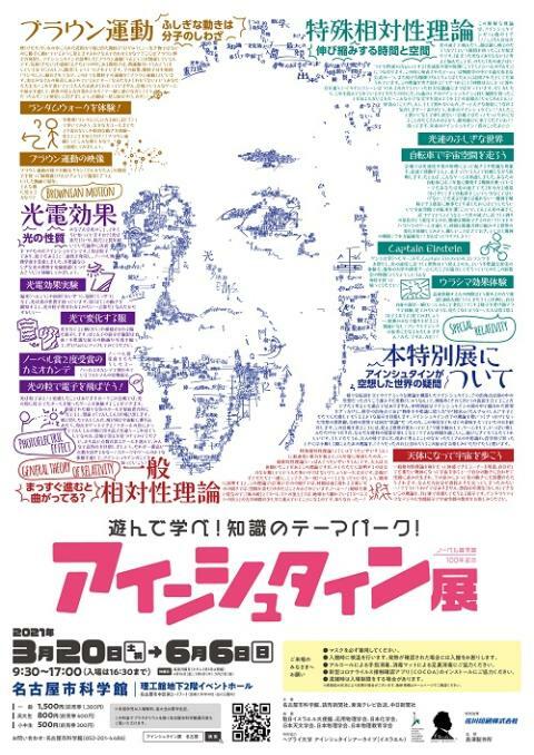 チケットは、期間中1回有効。開館時間=9:30~17:00(入場は16:30まで)。毎週月曜日(ただし5/3(月・祝)は開館)、4/16(金)、5/6(木)、5/21(金)休館。未就学児童は無料。身体障がい者手帳などをお持ちの方とその付添いの方2名までは証明書提示で当日料金の半額で入場可。本券でプラネタリウムを除く名古屋市科学館展示室をご覧頂けます。マスク着用、アルコール消毒、検温をお願い致します。状況により入場制限をする場合がございます。諸事情により展覧会の中止や会期の変更となる場合がございます。詳細は展覧会ホームページにてご確認下さい。https://einstein-nagoya.com/