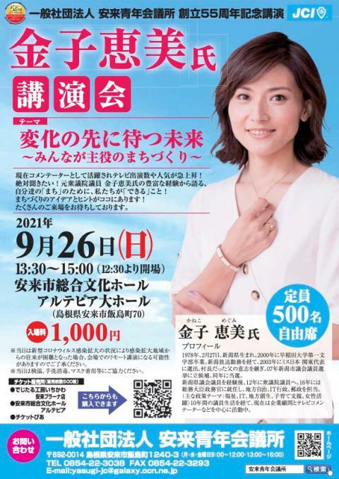 金子恵美氏講演会 21/9/26(日) 安来市総合文化ホール アルテピア 大ホール シェア ツイート テーマ「変化の先に待つ未来~みんなが主役のまちづくり~」 開催情報 ジャンル トークイベント 当日は新型コロナウィルスの感染状況によりWEBでの出演の可能性があります。また当日は検温、手洗消毒、マスク着用にご協力ください 料金 自由席-1,000円 表示できるチケット情報はありません詳しくはこちら キャスト&スタッフ 出演 金子恵美 [出演]金子恵美 お問い合わせ 一般社団法人安来青年会議所 シェア ツイート