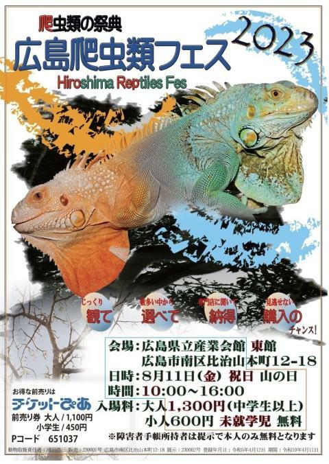 広島爬虫類フェス2023summer 23/8/11(金) 広島県立広島産業会館 東展示館 シェア ツイート 広島爬虫類フェス2023summer世界中からエキゾチックアニマル大集合 開催情報 ジャンル 街 未就学児は無料です。イベント中止を含むいかなる場合も払い戻しは出来ません。ペット同伴の入場は固くお断りします。当日の再入場は制限がありません。 料金 入場券 大人-1,100円 入場券(小学生)-450円 表示できるチケット情報はありません詳しくはこちら お問い合わせ 爬虫類フェス実行委員会 シェア ツイート