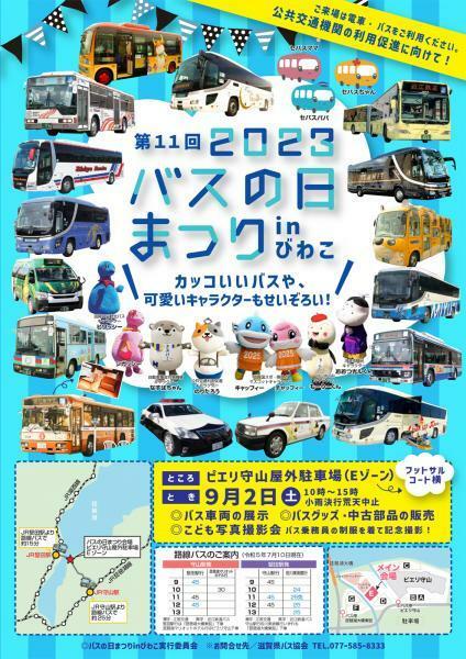 バスの日まつりinびわこ 23/9/2(土) 滋賀県守山市/ピエリ守山/屋外駐車場 シェア ツイート 9月20日の「バスの日」にちなみ「バスの日まつりinびわこ」が、ピエリ守山で開催されます。装備の充実した大型観光バスや、都市を結ぶ都市間高速バス、地域住民のお出かけに応えるコミュニティバスなどのさまざまなバス車両の展示のほか、バスグッズの販売など、バスとふれあえるイベントが行われます。 開催情報 ジャンル 企画展 10:00~15:00 ※少雨決行、荒天中止 料金 参加無料 お問い合わせ 一般社団法人滋賀県バス協会 公式サイト シェア ツイート
