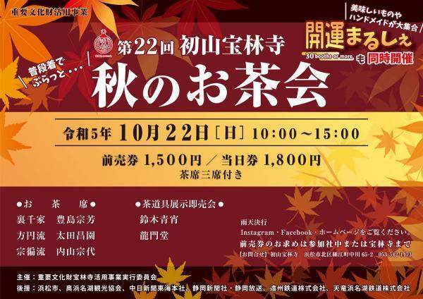初山宝林寺「秋のお茶会」と「開運まるしぇ」 23/10/22(日) 静岡県浜松市/初山宝林寺 シェア ツイート 優雅な秋の一日が楽しめる「秋のお茶会」が、初山宝林寺で催されます。お煎茶「方円流」、お抹茶「宗偏流」、「裏千家」の3流派によるお茶を堪能できます。「開運まるしぇ」も同時開催され、美味しいものや楽しいものなど30ブースが出店されます。 開催情報 ジャンル 街 10:00~15:00 料金 当日券1席/600円、茶席3席付つき/前売券1500円・当日券1800円 お問い合わせ 初山宝林寺 公式サイト シェア ツイート