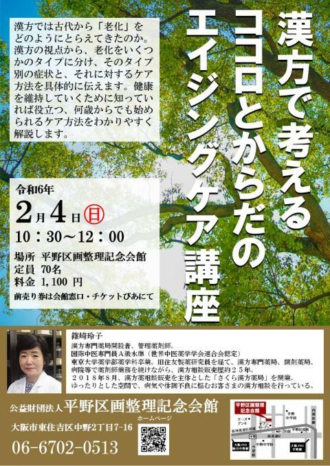 漢方で考えるココロとからだのエイジングケア講座 24/2/4(日) 平野区画整理記念会館 シェア ツイート 漢方から「老化」をとらえ、健康を維持していくためのケア方法を伝えます 開催情報 ジャンル トークイベント 払戻不可 料金 全席自由-1,100円 表示できるチケット情報はありません詳しくはこちら キャスト&スタッフ 出演 篠崎玲子 [出演]篠崎玲子 お問い合わせ 公益財団法人平野区画整理記念会館 シェア ツイート
