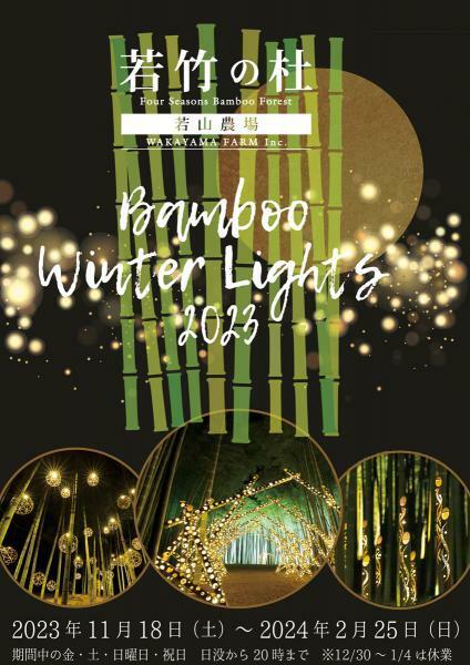 若竹の杜 若山農場 Bamboo Winter Lights2023 23/11/18(土)~24/2/25(日) 宇都宮市/若竹の杜 若山農場 シェア ツイート 竹林ライトアップと竹あかりの共演が、今年も若山農場の冬を彩ります。「光が愛でる、美しき竹夜の世界」をテーマとした竹が、寒色や暖色を纏い染まる演出は、息を呑むほどの荘厳さが漂います。暗闇の中に切りとられた夜の竹林風景を、竹あかりの光がやさしく幻想的に照らし出し、訪れる人を魅了します。 開催情報 ジャンル 季節 日没~20:00 料金 ライトアップ入場料/大人1500円、小中学生1000円、3~5歳500円 お問い合わせ 若竹の杜 若山農場 公式サイト シェア ツイート