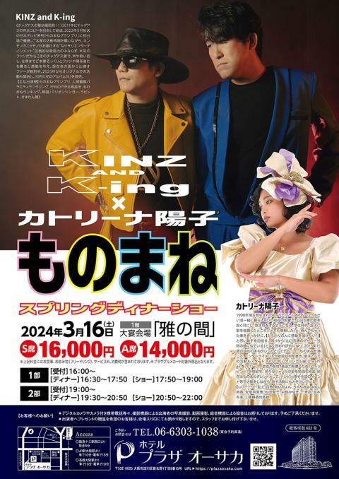 KINZ&K-ing カトリーナ陽子 ディナーショー【1部】 24/3/16(土) ホテルプラザオーサカ 雅の間 シェア ツイート ホテルプラザオーサカ恒例のものまねディナーショー! 開催情報 ジャンル 食 料金にお料理代、フリードリンク代、サービス料、消費税が含まれております 料金 ディナーショー1部S席-16,000円 ディナーショー1部A席-14,000円 表示できるチケット情報はありません詳しくはこちら キャスト&スタッフ 出演 KINZ&K-ing カトリーナ陽子 [出演]KINZ&K-ing / カトリーナ陽子 お問い合わせ ホテルプラザオーサカ 宴会予約係 シェア ツイート