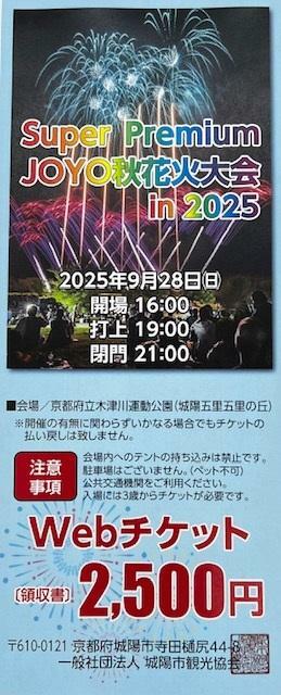 Super Premium JOYO 秋花火大会 in 2025 25/9/28(日) 京都府立木津川運動公園 シェア ツイート SPJ秋花火大会in2025 秋の空の花火は、愛を深めます。 開催情報 ジャンル 季節 ※中止の場合、いかなる場合でも払い戻しは出来ません。ペット・テントの持ち込み禁止。喫煙場以外は禁煙。 料金 入場券-2,500円 表示できるチケット情報はありません詳しくはこちら お問い合わせ 一般社団法人城陽市観光協会 シェア ツイート