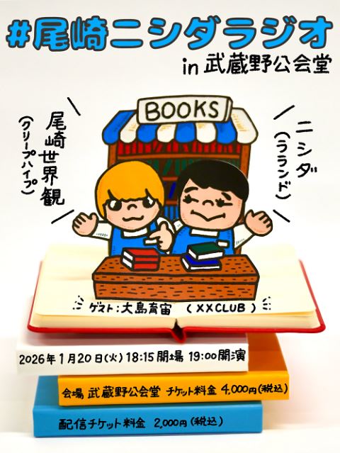 #尾崎ニシダラジオ in 武蔵野公会堂 26/1/20(火)~26/2/15(日) PIA LIVE STREAM シェア ツイート 開催情報 ジャンル トークイベント こちらのチケットをご購入いただくとオンライン動画配信をご覧いただけます。配信時間・出演者は予定のため変更の可能性あり。 料金 視聴券-2,000円 表示できるチケット情報はありません詳しくはこちら キャスト&スタッフ 出演 尾崎世界観 ニシダ ゲスト 大島育宙 [出演]尾崎世界観 / ニシダ [ゲスト]大島育宙 お問い合わせ PIA LIVE STREAMサイト ヘルプ シェア ツイート