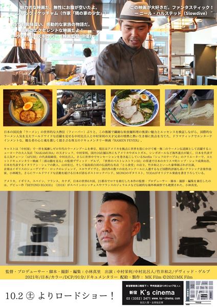 日本のラーメンで世界中に店舗を広げる中村兄弟に迫ったドキュメンタリー映画。ニューヨークに店舗を持つ“NAKAMURA”のシェフ、中村栄利と、世界中でチェーン展開する“AFURI”を経営する中村比呂人を追う。監督は、小林真里。インタビューでは、デヴィッド・ゲルブ、成澤由浩、山田宏巳、竹井和之らが中村兄弟について語っている。
