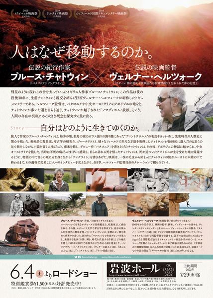 巨匠ヴェルナー・ヘルツォーク監督が、生前に親交のあった英国の作家で旅人だったブルース・チャトウィンの、没後30年に際して製作したドキュメンタリー。チャトウィンを魅了した、人間の根底にある“ノマディズム/放浪”を探求するために、パタゴニアや中央オーストラリアのアボリジニの地などチャトウィンの足跡を監督自らが辿っていく。