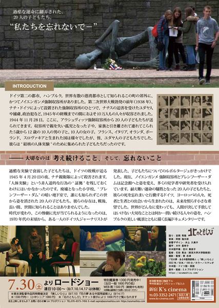 現在は記念館に姿を変えたノイエンガンメ強制収容所とブレンフーザー・ダムで行われた非道な実験の犠牲になった子供たちに迫ったドキュメンタリー。ドイツのジャーナリストが発表したルポルタージュを基に、第2次大戦後、証拠隠滅され長きに渡り明るみに出ることのなかった人体実験記録を、現在の美しいハンブルクと共に映し出す。監督は東志津。