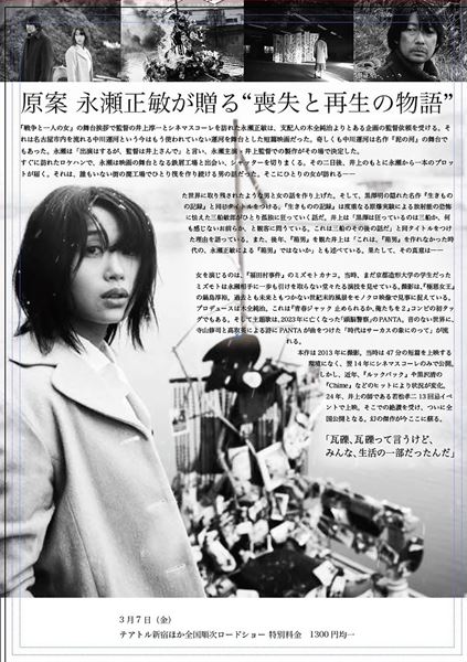 『戦争と一人の女』の井上淳一監督が、2013年に撮影を行った短編映画を12年の時を経て劇場公開。廃墟のような街で瓦礫を拾い筏を作る男と、そこに訪れた女の喪失と再生を描く。現在は使われていない、名古屋市の中川運河で撮影を行った。主演は永瀬正敏。主題歌は、頭脳警察のボーカル・PANTA。共演は『福田村事件』のミズモトカナコ。