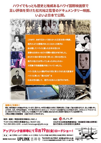 ハワイ国際映画祭2021で公式セレクト作品となったドキュメンタリー。ハワイへの集団移民から約150年、あまり知られていなかった日本女性の歴史やハワイで生まれた日系女性の姿を映しだすと共に“真の日本人”とは何かを問いかける。ハワイ在住の日系二世による貴重な証言が収録されている。松元裕之が、企画、演出、脚本、撮影を手がけた。