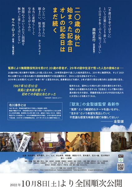 布川事件で無実の罪に問われ無期懲役刑に処されるも、2011年無罪判決を受けた桜井昌司の判決から12年間を追ったドキュメンタリー。20歳の若さで29年間収監された波乱の人生を前向きに捉える桜井の生き様や、袴田事件・東住吉事件・狭山事件の関係者インタビューも収め、冤罪とそれを覆す難しさを考える。監督は金聖雄。語りは小室等。