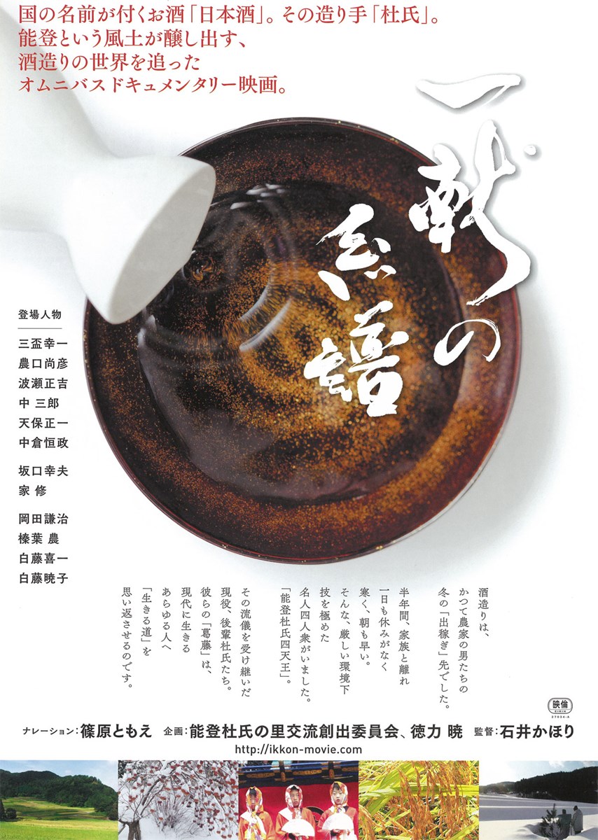 前作『ひとにぎりの塩』で能登半島に伝わる“塩づくり”を追いかけた石井かほり監督が、今度は能登で、酒造りの技能集団“杜氏”の仕事を描くオムニバス・ドキュメンタリー。日本四大杜氏のひとつ“能登杜氏”から、もはや稀少となってしまった本物のものづくりの真髄に迫る。ナレーションは女優、歌手、デザイナーと多彩に活躍する篠原ともえ。