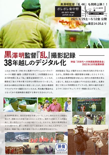 映倫の次世代の映画推薦委員会の推薦映画に選ばれる他、40分の短縮版が7カ国の映画祭で最優秀監督賞などに輝いたドキュメンタリー。1985年に公開された『乱』の撮影現場にメイキング撮影班として参加した、当時大学生だった河村光彦監督が、世界に名を馳せる巨匠・黒澤明監督が役者陣に声をかける様子や、仕事に向き合う姿を映し出す。