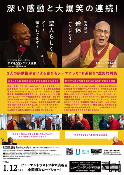 チベット仏教の最高指導者ダライ・ラマ14世と、アパルトヘイト撤廃運動の指導者デズモンド・ツツ大主教の対談を基にしたドキュメンタリー。ダライ・ラマ邸で撮影された未公開映像を中心に宗教の垣根を越えて幸せや死生観が語られていく。また、幸福研究で著名な博士たちによる科学的な根拠に基づく考えも展開される。監督は、ルイ・シホヨス。