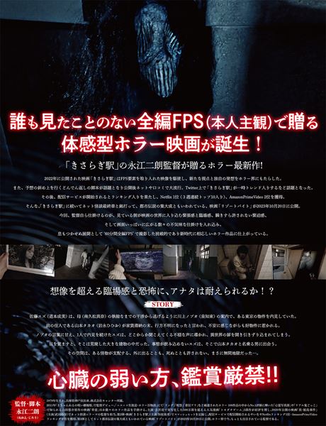 『きさらぎ駅』を手がけた永江二朗監督が、60分全編を一人称視点で製作したホラー。ある怪物に支配され荒れ果てた世界にそびえる建物に足を踏み入れた女性が、外に出ることも死ぬことも許されない、地獄のような空間でさまよっていく。出演は道本成美、泉知束、『イバラ・夜の祈り』の米澤成美、『ゆりに首ったけ』の南久松真奈、岩永ひひおら。