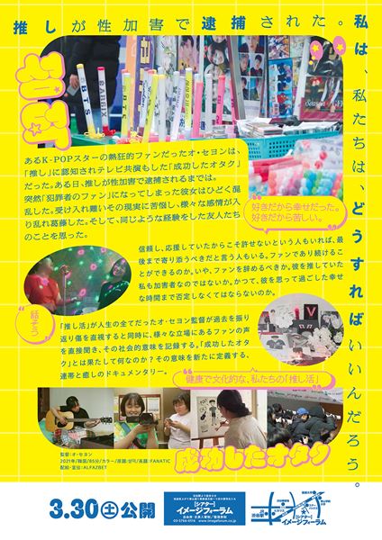 韓国の芸能界を揺るがした性加害事件をきっかけに製作された社会派ドキュメンタリー。K-POPの熱狂的なファンであり、テレビ共演も果たして成功したオタクと呼ばれたオ・セヨン監督が、推しが逮捕されたことで、犯罪者のファンとされ、受け入れがたい現実に悩み、同じ境遇にあるファンの話を記録し、成功したオタクについて再考していく。